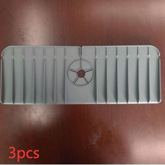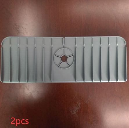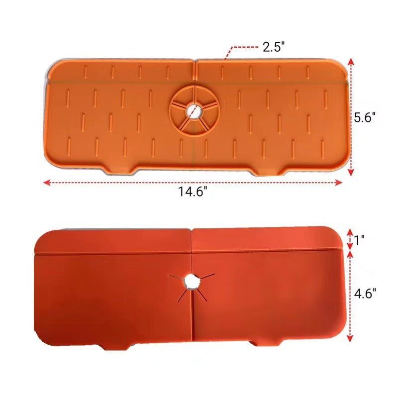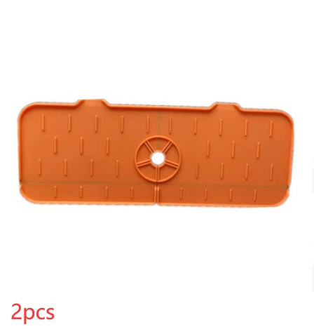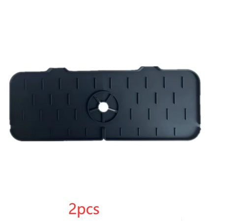 Try This Silicone Faucet Handle Drip Catcher Mat. This sturdy, flexible mat stays in place, drains well, and keeps the countertops dry