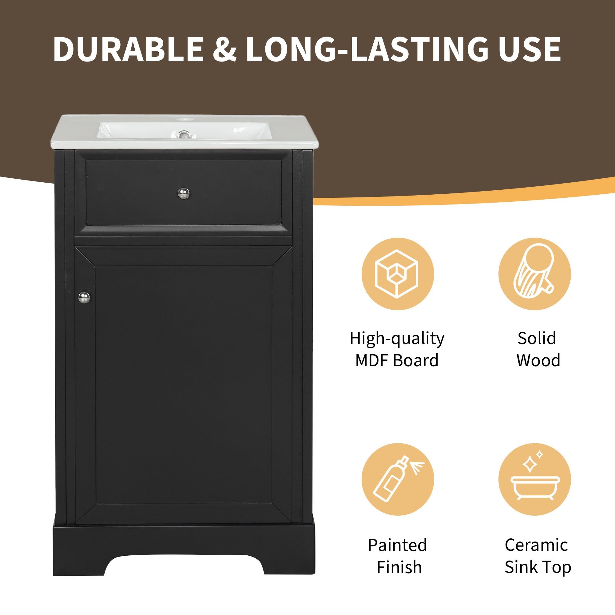 Material - Practicality and durability is important to bathroom facilities, so we use real wood and MDF boards for this product, which not only increases the product stability but also ensures a long-lasting use. Furthermore, the surface of this vanity cabinet is in painted finish. It is water-proof, stain proof and very easy to clean.