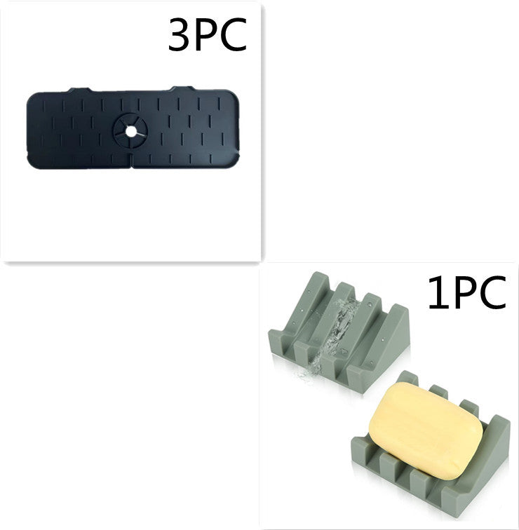 Try This Silicone Faucet Handle Drip Catcher Mat. This sturdy, flexible mat stays in place, drains well, and keeps the countertops dry